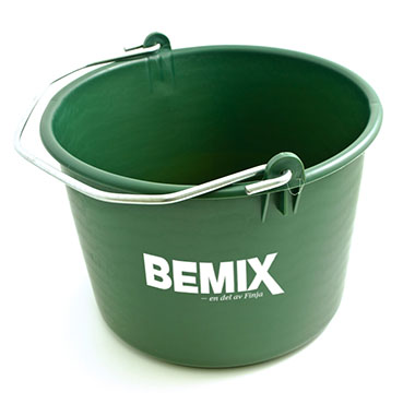 Robust mixing bucket. The hooks face inward and do not catch in trousers. Practical pouring nozzle. Finger grip on underside. 20 l.